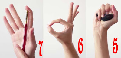 بكرة مطاطية بين الأصبع المدود والإبهام، ولف الكرة في اتجاه راحة اليد والعكس،